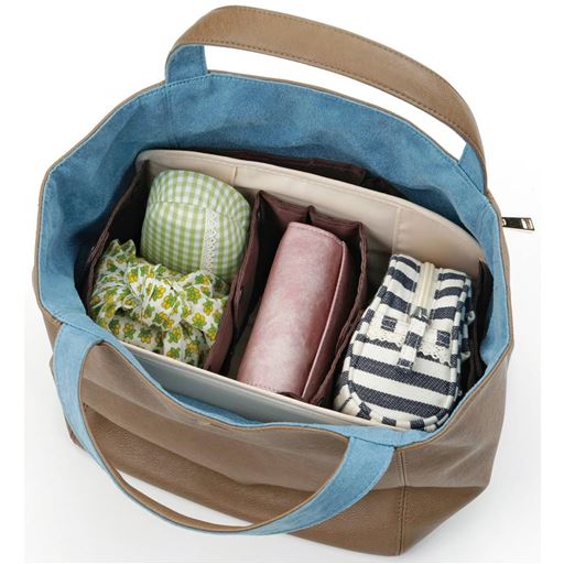 ※仕切りは底部分で縫製されておりません。 サイズ 横幅:約24cm 縦:約19cm マチ:約155cm 持ち手の長さ:約37cm 素材 キャンバス:綿100% コーデュロイ:綿100% ファー:ポリエステル100% 重さ 約350g ポケット 内側:オープンポケット×2 外側:オープンポケット×1 仕様 ・開閉:ボタンなし ・裏地:なし ・3室に分かれる仕切り付 ・ゴールドのチャーム付 (キャンバス、コーデュロイの バッグインバッグに常に持ち歩くものを入れ、仕切り代わりに。 奥に仕事用品、手前にメイク道具などを入れました。 整理に便利なアイテムと「中仕切り」の自作アイデア 透明ポーチ 細かなアイテムはポーチにまとめるとすっきりします。トートデザインのバッグインバッグ トートがそのまま小さくなったような形で、ナチュラルなバッグにも馴染みます。 ミニサイズでも、ペットボトル入れや3部屋の仕切りなど、使い勝手の良いつくりです。 マチが11cmと広く、パイピングが施された底でしっかり自立してくれます。 違うバッグを使う時も、入れ替えだけで準備ができる便利さも魅力。 飽きのこないシンプルなデザインで、定番とし